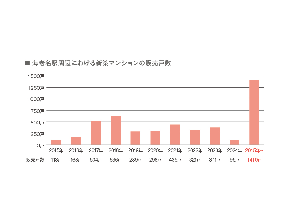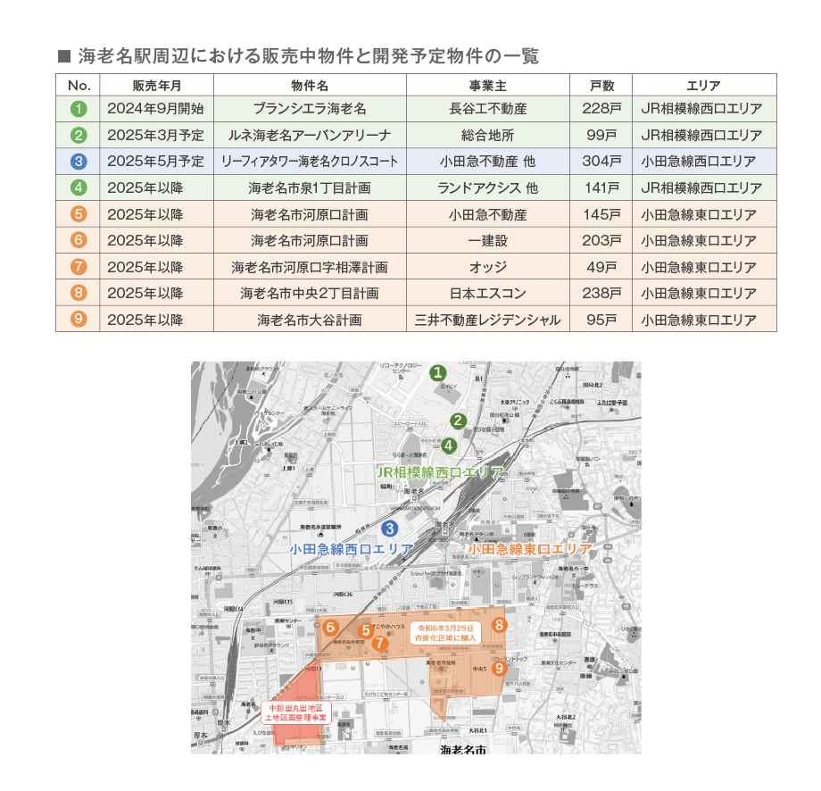 今後、販売が予定される物件は、これまでに供給がされていない、海老名市役所周辺に集中しており、海老名駅徒歩10分以上となる距離感など、未知数な要素が含まれているが、未だ衰えを見せない再開発事業のほか、駅前だけでなく街全体のインフラの整備が進む海老名市だからこそ、これからの市場拡大に期待したい。