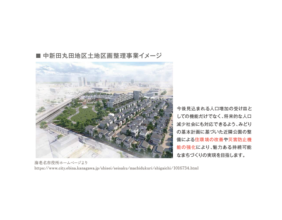 そして、住宅地の開発も旺盛だ。新たに市街化区域へ編入されたエリアの中で、厚木駅方面の街区では、本年6月に中新田丸田地区土地区画整理事業の造成工事が着手され、商業街区・公園街区・共同住宅街区・戸建街区の4つで構成された複合的な市街地の形成を目指している。さらに海老名市役所周辺エリアでは、5物件約730戸の新築マンションが計画中だ。