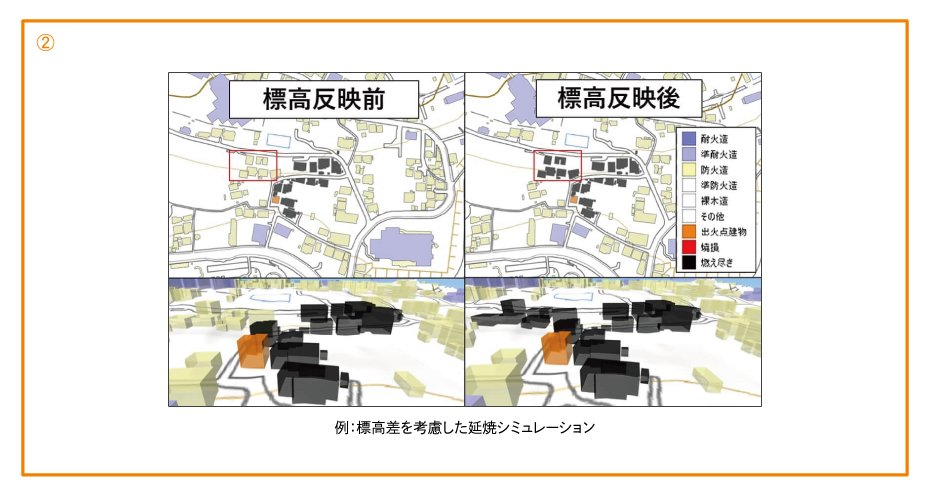 相模原市には、傾斜地にも多くの住宅が存在し建物自体の高さのみならず、地盤の標高によっても延焼動態が異なることが想定され、標高反映の有無によるシミュレーションの差異を検証した。その結果標高を考慮した場合の方が延焼範囲が大きく、速度も速いことが確認された。
