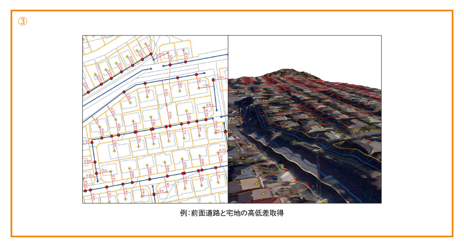 仲介業者が行う査定及び行政機関が行う固定資産税や相続税の評価は二次元地図だけでは把握が難しく、査定や評価に誤差が生じることがあるが、「PLATEAU」を使用した3D都市モデルの中に、不動産の査定に必要な仕組みを構築し、相続税路線価や土砂災害警戒区域等を重ねて表示することにより、公正・公平な評価及び円滑な合意形成などが期待できる。