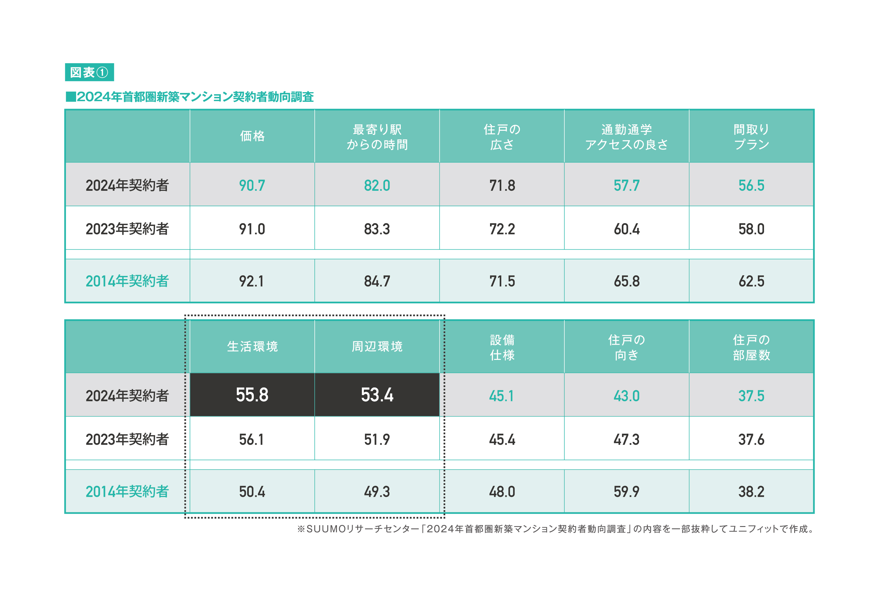 これは新築マンションの契約者を対象に実施したアンケート調査であり、表中の項目は物件を検討する上で重視した内容を聞き取りしたアンケート結果をポイントでまとめた資料である。2024年度の契約者を見ると、「価格」「最寄り駅からの時間」「通勤通学アクセスの良さ」「間取りプラン」「仕様設備」「住戸の向き」「住戸の部屋数」など、多くの項目で10年前より下がっているのに対して、「生活環境」「周辺環境」は逆に上がっている。この結果は不動産価格高騰の影響で、物件のスペックは少なからず妥協するが、住環境や暮らし方は重視したいという契約者の志向が結果に現れている。