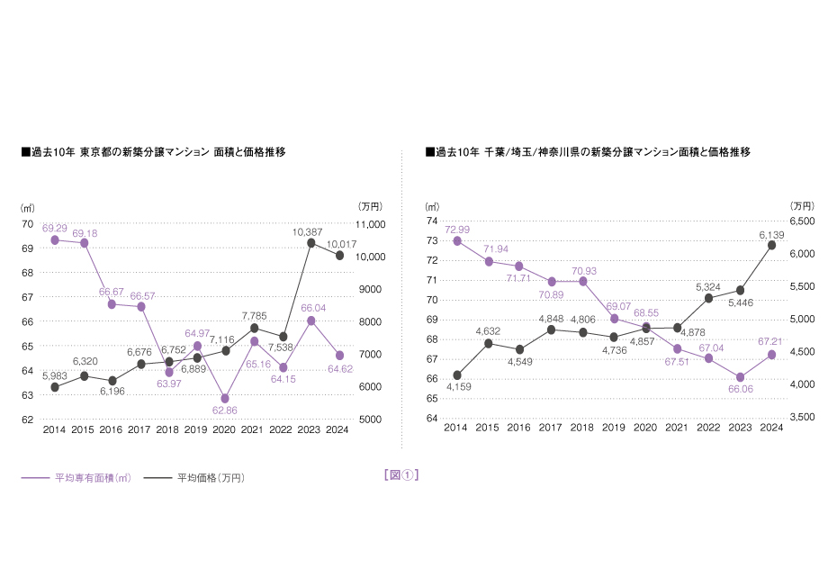 昨今の首都圏の新築分譲マンションは価格の高騰や1部屋数億円のタワマンなど、お金の話題に注目が集まりがちだが、その他にも市場に変化が起きている。東京都内で2024年に発売された新築分譲マンションの平均専有面積は64.62㎡であったが10年前にあたる2014年の平均値と比較すると約5㎡、割合にして7%程度減少している。同様に、千葉/埼玉/神奈川県で2024年に発売された新築分譲マンションの平均専有面積は67.21㎡であったが10年前にあたる2014年の平均値と比較すると約6㎡、割合にして8%程度減少している。1都3県において「70㎡台」が一つの目安だった時代から比べると、コンパクト化-狭小化が顕著である。[図①]