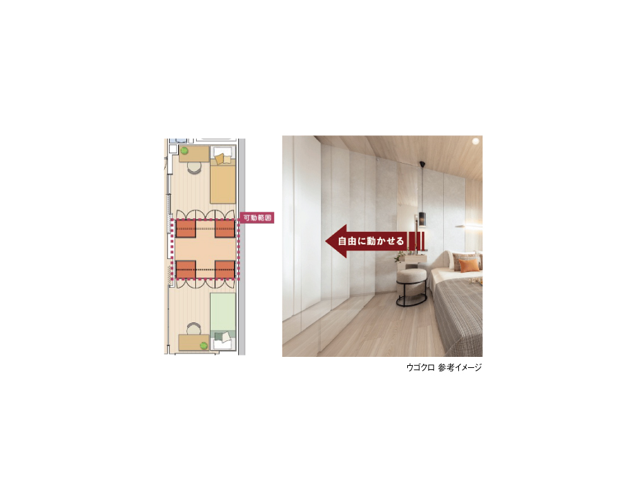 全389戸のうち約9割が「ウゴクロプラン」という収納空間の広さを変更すことができる可動収納ユニットを搭載しており、「空間対効率」を重視した住戸が高評価であった。