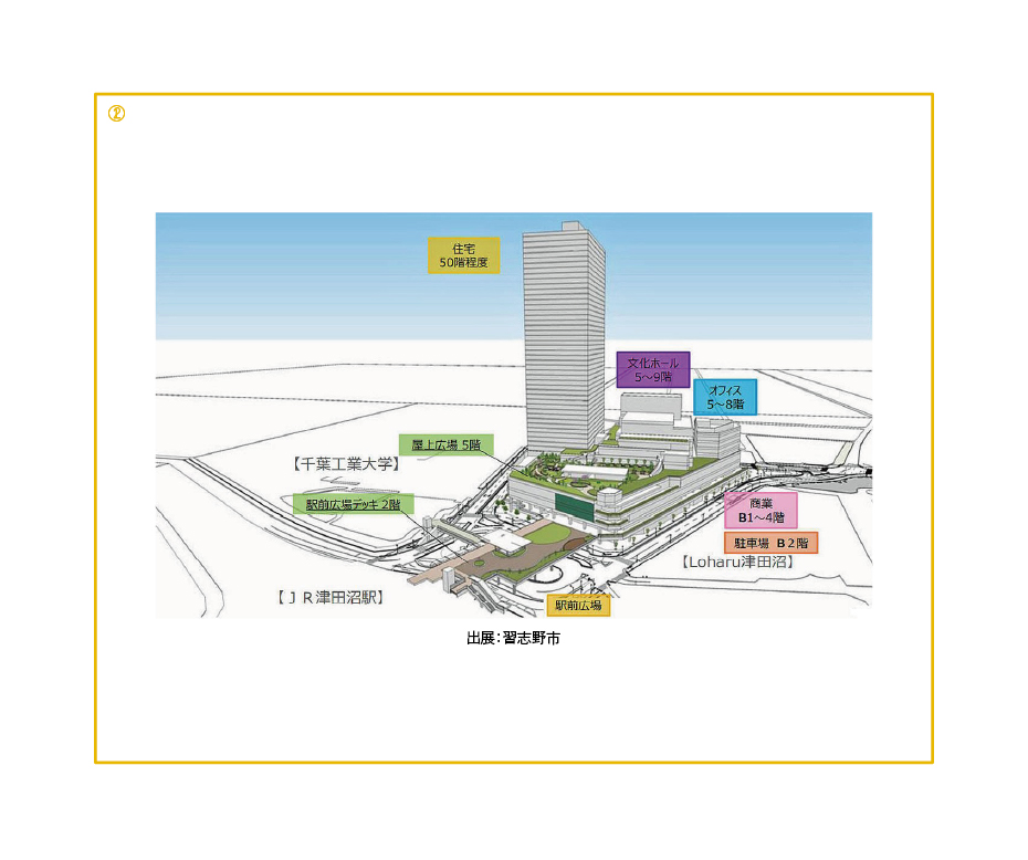 象徴的なのが中野サンプラザの再開発(画像①)だ。大規模ホールを含む複合施設として建て替えが高層されたが、物価高や資材高騰、権利調整などの難航などから計画は一旦白紙に戻された。また、千葉県の津田沼駅南口地区では野村不動産による再開発計画(画像②)が2025年5月に正式に延期(一時中断)と発表された。