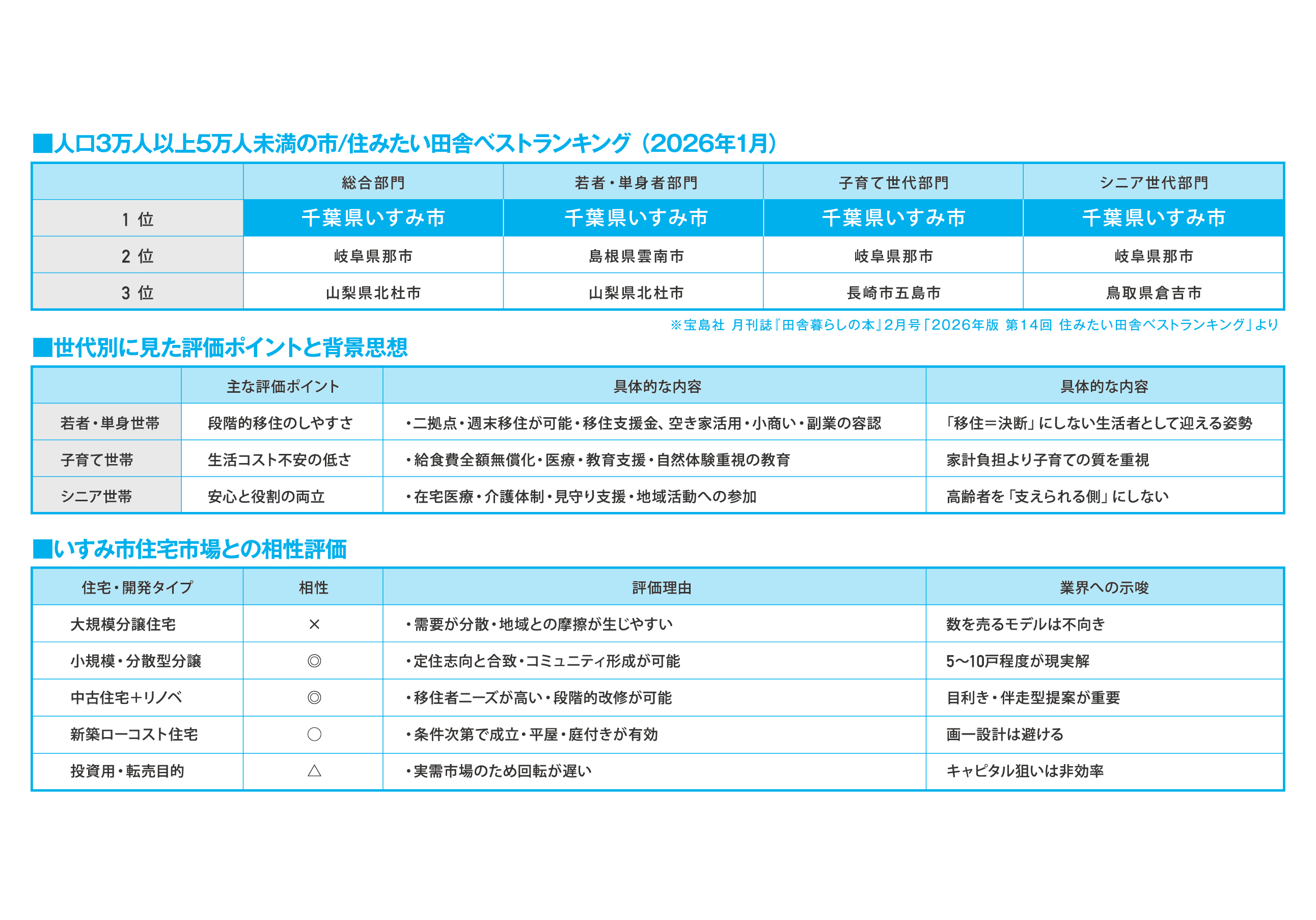 住みたい田舎ベストランキング全項目1位という結果は、その積み重ねの可視化に過ぎないが、不動産・住宅業界、そして自治体にとって、いすみ市は今後の地方の住まい方を考える上で、極めて示唆に富んだ存在と言えるだろう。