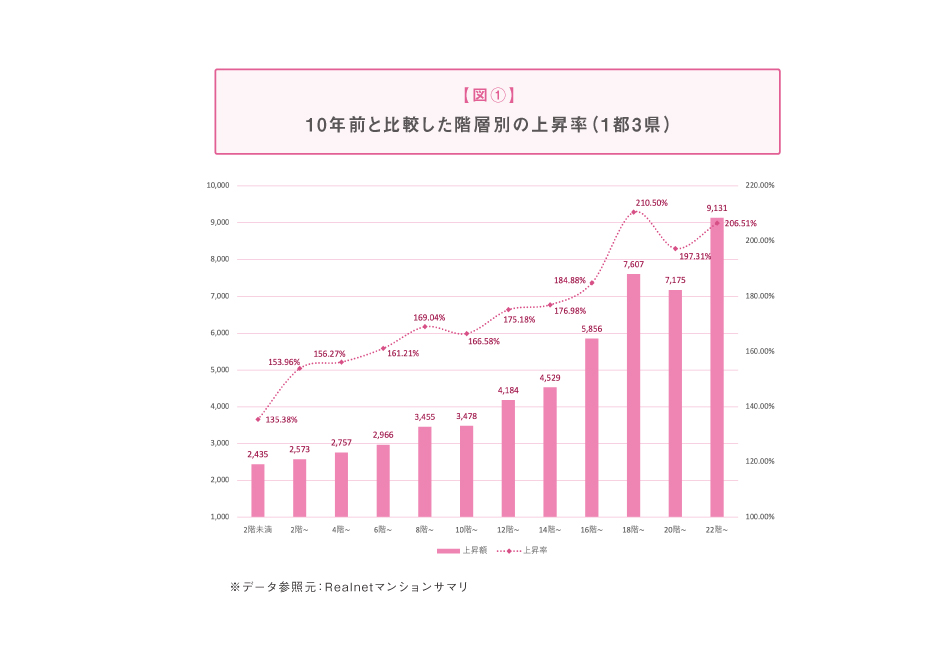 平均価格には幅の異なる数億円の住戸も一般的な住戸も同じ重さで計算されるため、価格差が大きいほど数字は動きやすくなる。つまり平均は「中心の価格」とは違い、全体の合計がどちらに引っ張られているかを表す数字に近い。では実際に、10年前と比較した階層別の価格推移をみると中低層と高層階で価格の伸び方には大きな差が見られる。【図①】