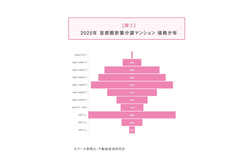 始めていることの表れと言える。居住用・投資用・別荘用といった従来の分類だけでは捉えきれない需要が、観光地を中心に生まれてきているのだ。もちろん、従来の不動産制度や税制の枠組みの中で、いきなり市場が大きく変わるわけではない。それでも、観光客が集まる都市からこうした商品が生まれ始めたという事実は、観光地の不動産市況がこれから変化していく前触れと捉えていいだろう。札幌、沖縄に続き、今後は日本各地の観光地でも、「住む」「滞在する」「所有する」の境界をまたぐ新たなマンションのあり方がひとつの選択肢として定着していく可能性がある。6階程度までの低層では、2016年からの上昇額は2,500〜3,000万円程度だが、同様に10階〜15階程度では3,500〜4,500万円、20階まででは7,000∼7,600万円、それ以上になると9,000万円を超える額となっている。全ての階層で価格は上昇しているが、伸び方は均一ではなく上層になればなるほど上昇幅は増していき、額だけでなく高層階では上昇率も200%を超えるなど、大きく市場を釣り上げていることが目に見えてわかる。実際に大型物件やタワーマンションを見ると、この構造ははっきりと現れる。例えば八王子駅周辺では2025年の平均価格は昨年より2,235万円上昇しているが、20階以上を除くと上昇幅は1,026万円に縮まる。平均の上昇の多くは、限られた住戸によって生まれていることになる。では、高層階が平均価格を引き上げていることは理解したが、それとは別に首都圏における新築分譲マンションの供給戸数の価格帯はどのようになっているのかを探っていく。下記は2025年の新築分譲マンション価格の分布を表した図だが、1億円以上の住戸も数多く存在し、市場の上限は確かに押し上げられている。ただし戸数の厚みで見ると中心は6,000万〜7,000万円付近に集中し、ここが最も多くの供給を占めている。高額帯は目立つ存在ではあるが、市場の中心が移動したというより上方向に裾野が広がったと捉える方が実態に近いと思われる。【図②】