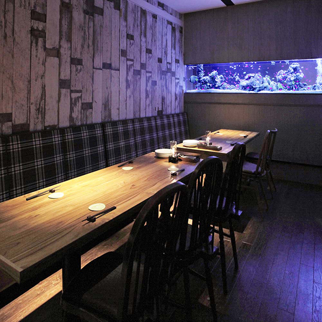 いつもの居酒屋ではなく、青い水槽が輝くオシャンなお店で