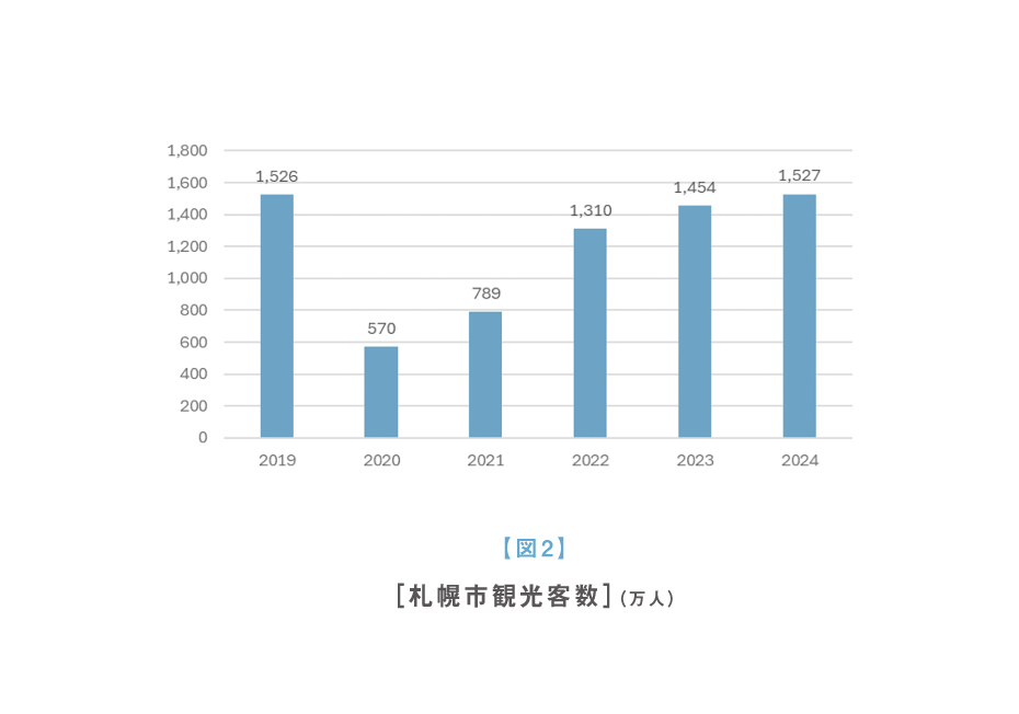 民泊マンションが登場しているのは、札幌や沖縄といった「観光地としての強さ」を持つエリアだ。札幌は夏と冬で明確にピークシーズンが分かれる典型的な観光都市であり、国内外から多くの人が集まる。札幌市の統計によれば、2023年に札幌を訪れた観光客数はコロナ渦前の水準をほぼ回復し、延べ宿泊者数は約1,450万人を超えた【図2】。特にさっぽろ雪まつりや夏の観光シーズンには市内のホテルがどこも満室に近い状態となり、予約が取れない状況が続いている。また、コロナの終息とともに観光需要が回復した沖縄では入域観光客数や観光収入が2024年に過去最高水準を更新し、同様に宿泊施設の需要は高まっている。