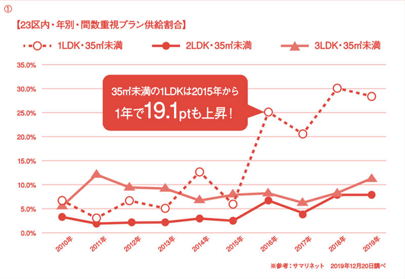近年、不動産価格は高止まりせず常に上昇傾向を維持している。そのため近年コンパクト物件が増加しているが、中でも間数はしっかり確保しながらも面積を圧縮した間数重視プランが多く供給されている。具体的には1LDK=35㎡未満、2LDK=50㎡未満、3LDK=65㎡未満の住戸だ。このような間数重視プランの供給割合は過去10年間で下のグラフ①のように推移している。グラフ①は東京23区内で販売された各間取りの総供給数の内、先述した面積に当てはまる住戸の割合を年別で表したグラフである。中でも特に伸びているのが1LDK・35㎡未満住戸の供給割合である。
