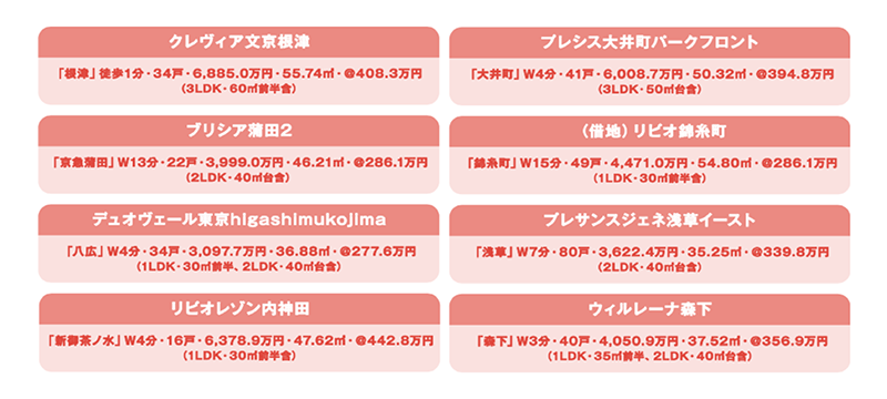 では近年増す間数重視プランについて実際売れ行きはどのような結果なのか。2019年この間数重視プランを備えた物件は約40件。その中でも約40%が初月申し込み率80%超の結果を生んでおり、中でも4件は100%という人気を見せた。さらにすでに今年完売している物件は8件、具体的に以下の物件が該当する。