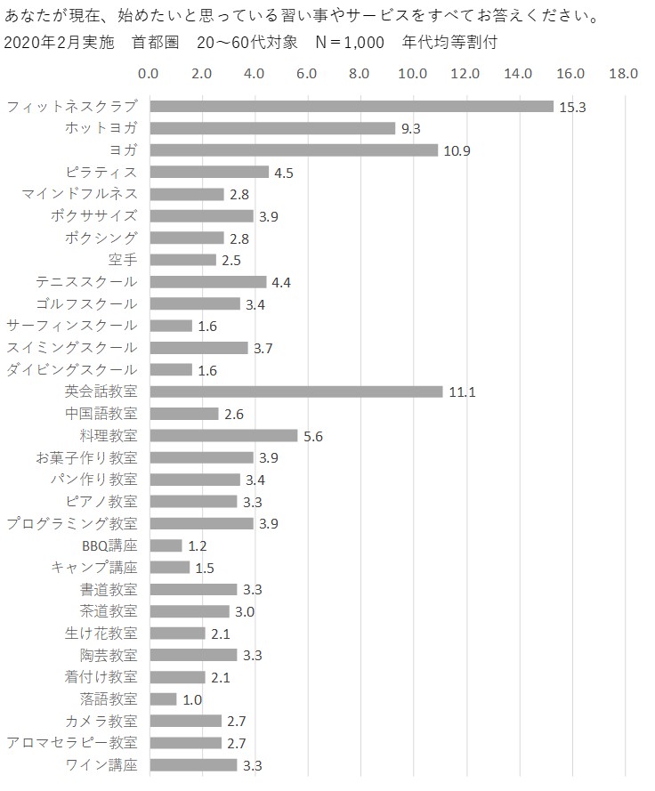結果とすると、「フィットネスクラブ」「ヨガ」「英会話」が他とは差をつけた3強となりました。