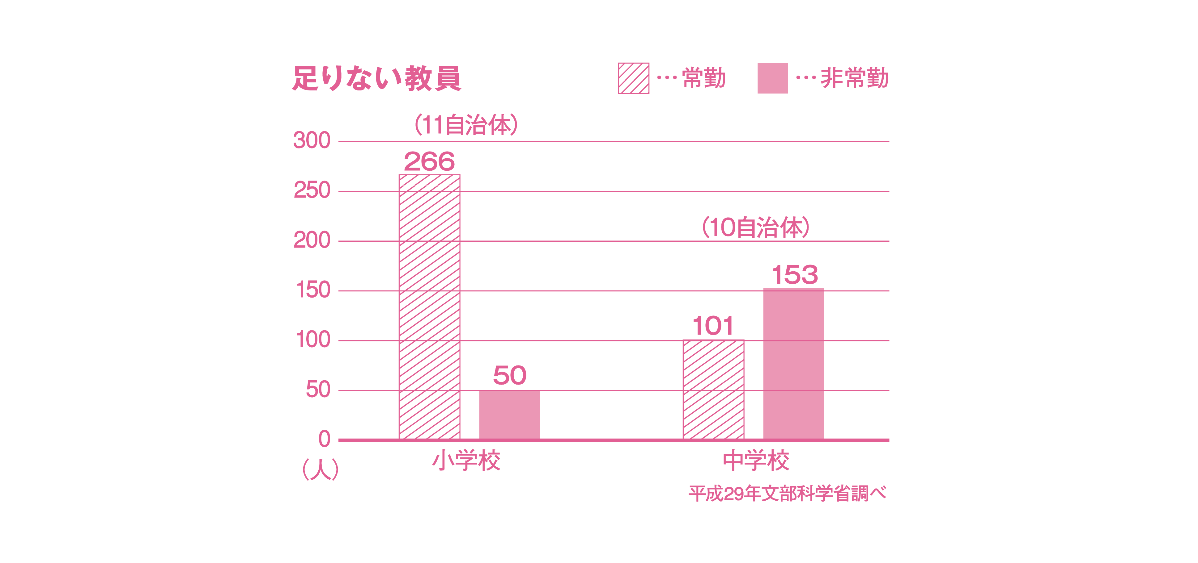 昨今、様々な企業で人手不足が課題となっている。これは学校の教員も同様だ。平成29年文部科学省が11の自治体に向けてアンケートをとった。その結果、常勤・非常勤合計すると小学校は1自治体あたり約30人、中学校は約25人教員が足りていないという結果となった。その要因として、就業時間の長さが考えられる。ベネッセのデータによると2016年時点における教員が学校にいる平均時間は12時間程度。さらに部活動を含め土日出勤をしているという教員は中学校で74.5%、高校で52.4%に上った。