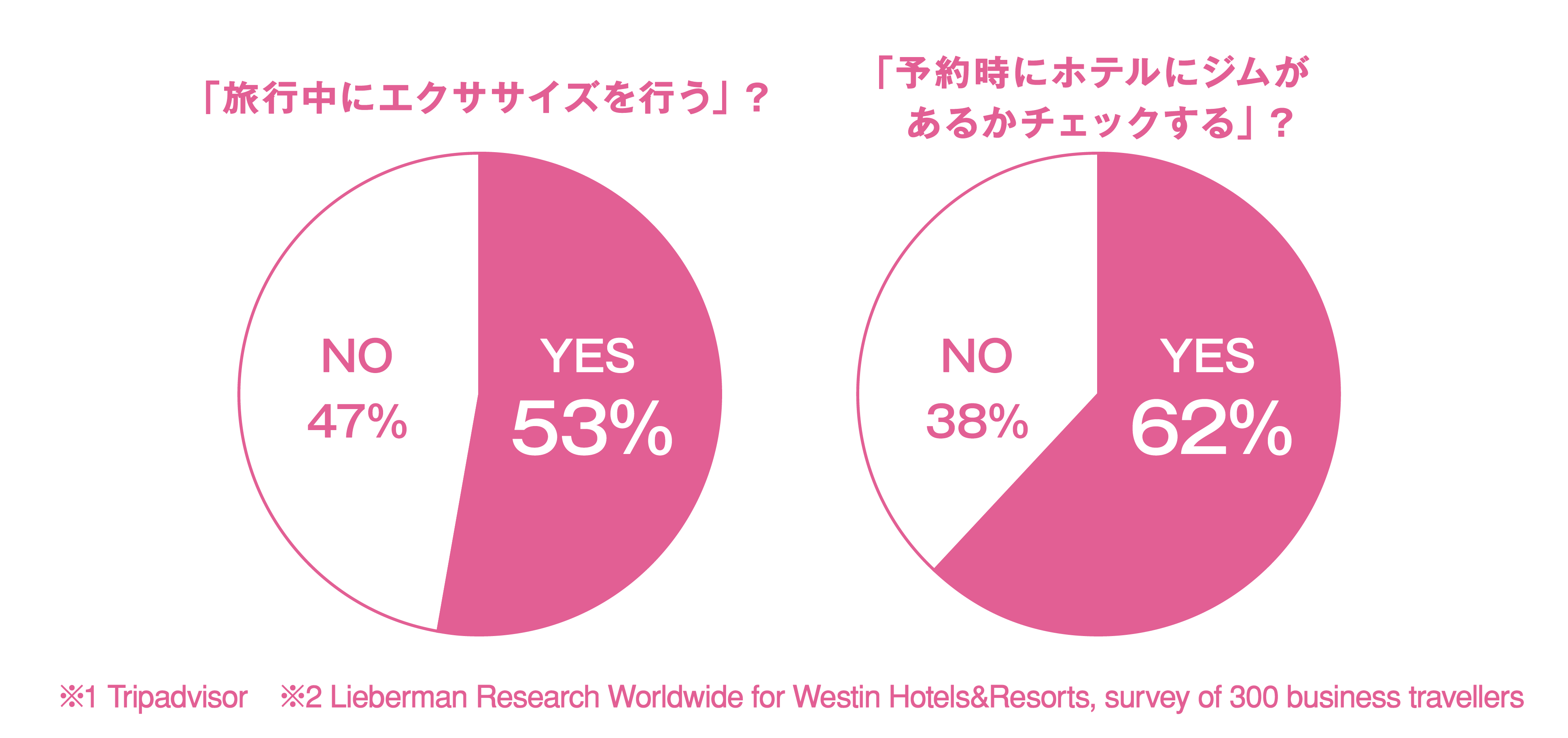海外の調査によると、アメリカ人旅行者の53%が「旅行中にエクササイズを行う」と回答※1、海外ビジネス客の62%が「予約時にホテルにジムがあるかチェックする」と回答※2しており、外国人客にとって、フィットネスジムがホテル予約の重要なファクターになっていることがわかる。(引用 TechnoGym http://www.technogym.co.jp/smallgym_lp/)