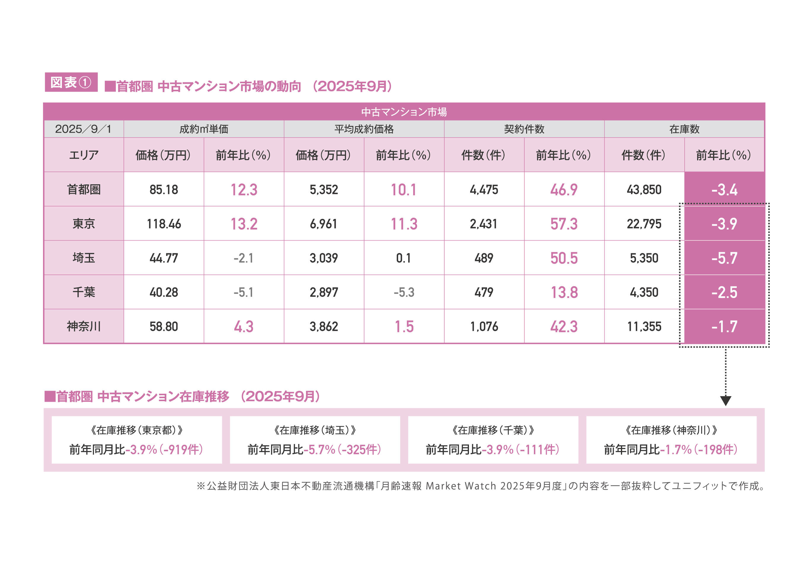 2025年度、首都圏における中古マンション市場は「価格上昇」「流通活性化」「在庫減少」という特徴を強めてきた。公営財団法人東日本不動産流通機構が発表している月例速報の最新情報【図表①】によると2025年9月度、首都圏中古マンションの成約㎡単価は約85.18万円 となっており、前年同月比+12.3%という伸びを見せ、平均成約価格は5,352万円と前年同月比+10.1%となっている。価格上昇が続く中で、2025年9月度の成約数は首都圏全体で4,475件であり、前年同月比+46.9%という増加を見せ、在庫件数は前年同月から1,500件以上の減少を記録している。ただし、注意すべきは「エリア間の格差」が拡大している点である。