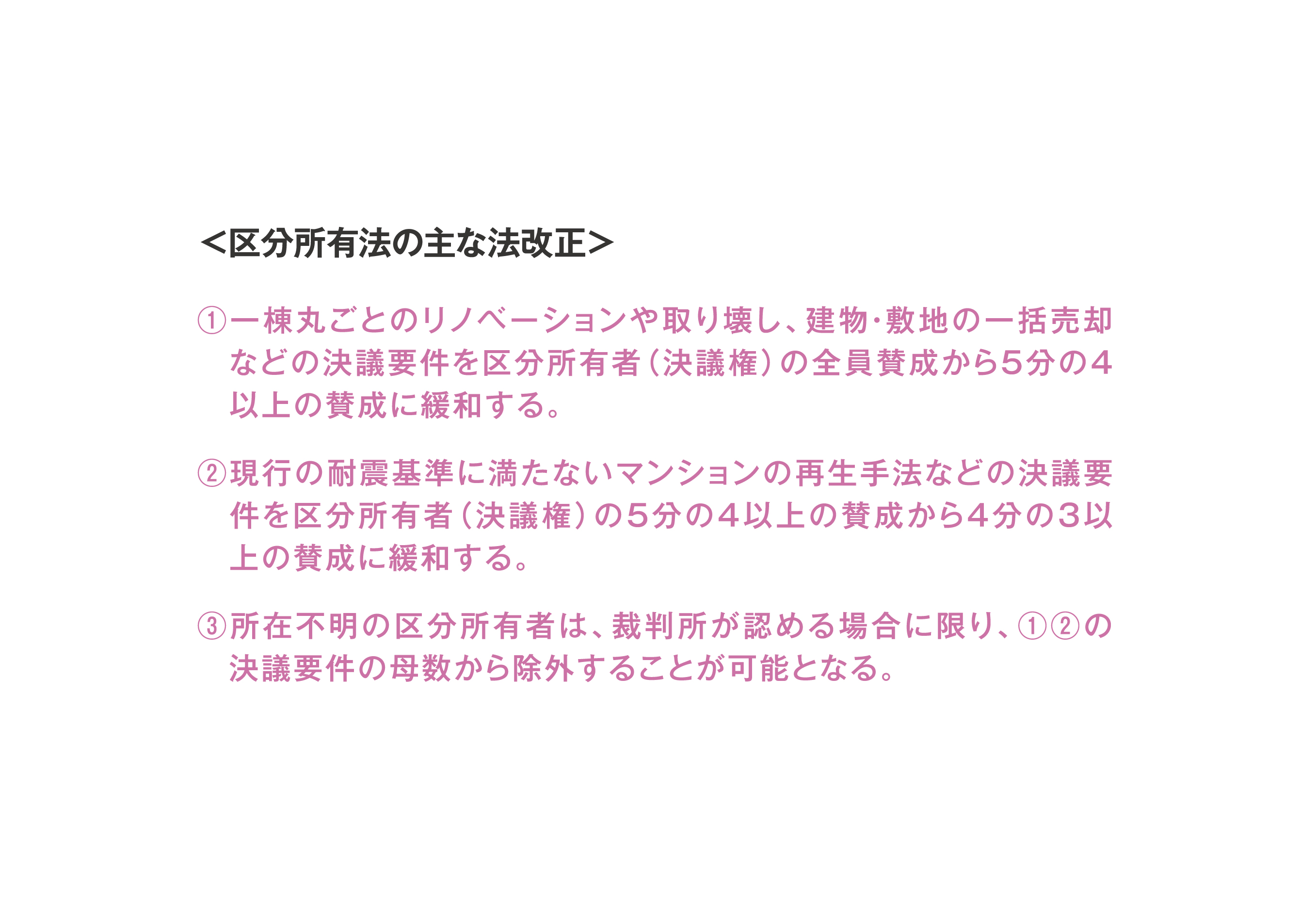 こうした流れの中で注目すべきが、2026年4月1日に施行されるマンションの管理・再生の円滑化等のための改正法案である。